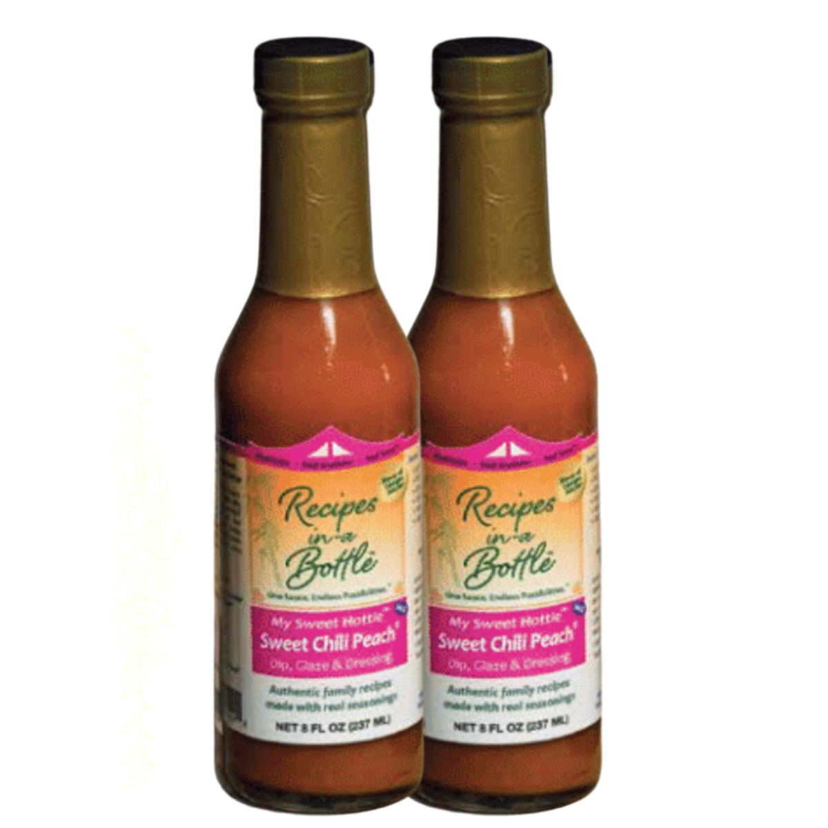 PREMIUM Selection: My Sweet Hottie™ (MILD) SWEET CHILI PEACH dressing, marinade and dipping sauce. Zesty sweet and sour sauce like none other with real fruit, honey and spices. Bursting with fresh flavors, not goopy sweet. No junk, clean label. Less salt/sugar. No high fructose corn syrups or cheap fillers. No MSG. Gluten Free. Soy Free.